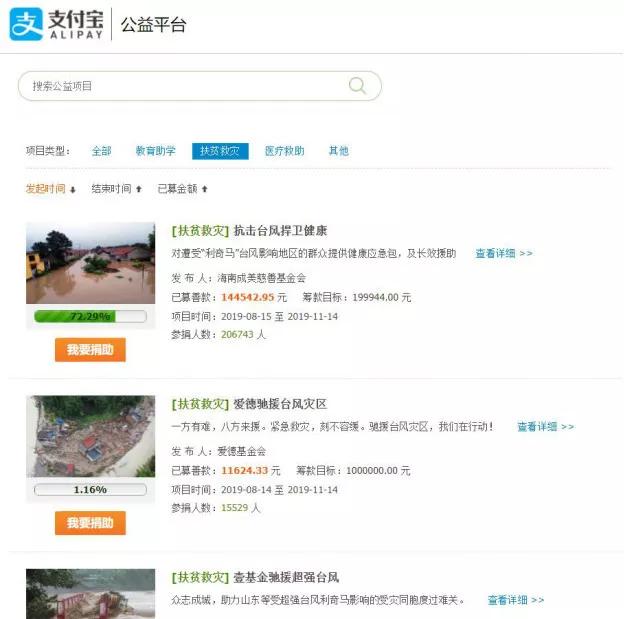今年第9號臺風(fēng)“利奇馬”發(fā)生20多天后,部分互聯(lián)網(wǎng)募捐平臺上關(guān)于臺風(fēng)救援的募款活動還在繼續(xù)。募款項(xiàng)目涉及災(zāi)后重建、心理健康、婦女兒童乃至災(zāi)區(qū)殘疾人幫扶等多個(gè)領(lǐng)域,而參與主體也不僅僅限于受災(zāi)地區(qū),全國各地公益機(jī)構(gòu)都有參與。