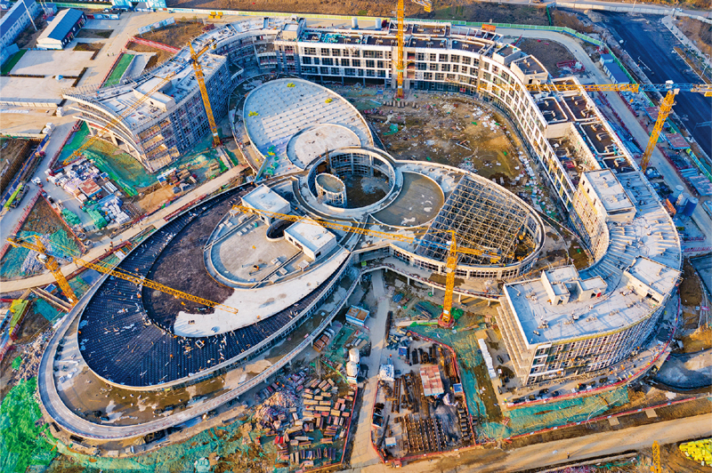 科技自立自強(qiáng)是促進(jìn)發(fā)展大局的根本支撐。圖為2020年12月16日,位于安徽省合肥市廬陽區(qū)的中科院聚變堆主機(jī)關(guān)鍵系統(tǒng)綜合研究設(shè)施項(xiàng)目主建筑1—4號(hào)科研樓的4號(hào)樓最后一處正在封頂施工。聚變堆主機(jī)關(guān)鍵系統(tǒng)綜合研究設(shè)施是《國家重大科技基礎(chǔ)設(shè)施建設(shè)“十三五”規(guī)劃》優(yōu)先布局的大科學(xué)工程項(xiàng)目之一,為我國開展聚變堆核心部件研發(fā)和建設(shè)提供技術(shù)基礎(chǔ)。 人民圖片 阮雪楓/攝