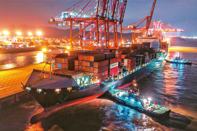 開放帶來進(jìn)步,封閉必然落后。面對世界風(fēng)云變幻,我國堅(jiān)定擴(kuò)大對外開放,放寬市場準(zhǔn)入,持續(xù)優(yōu)化營商環(huán)境,開放的大門越開越大,為我國經(jīng)濟(jì)發(fā)展和世界經(jīng)濟(jì)恢復(fù)注入了強(qiáng)大動(dòng)力。圖為2020年12月15日晚,一艘集裝箱船緩緩靠上寧波舟山港金塘港區(qū)大浦口集裝箱碼頭,這是大浦口碼頭新增航線——以星西非線的首航船。 人民圖片 姚峰/攝