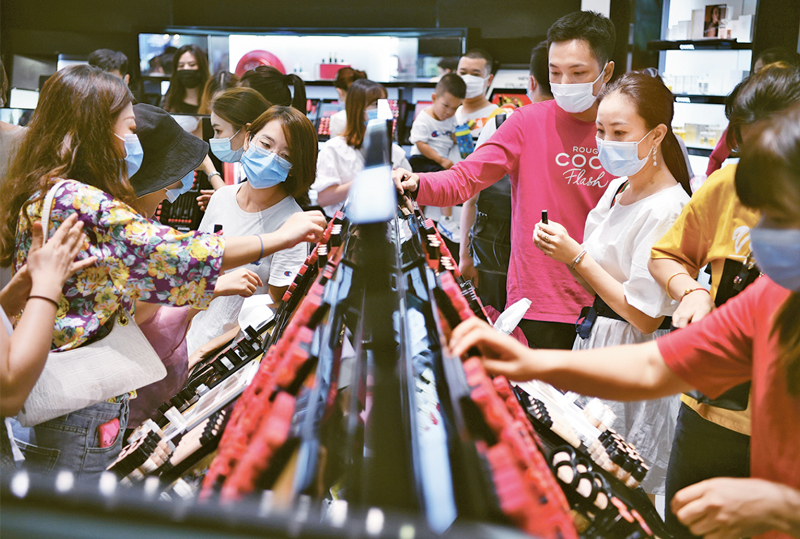 構(gòu)建新發(fā)展格局,必須堅(jiān)持?jǐn)U大內(nèi)需這個(gè)戰(zhàn)略基點(diǎn),把擴(kuò)大消費(fèi)同改善人民生活品質(zhì)結(jié)合起來。圖為2020年10月5日,游客在海南三亞國際免稅城購物。三亞國際免稅城是以免稅為主題,融商業(yè)、餐飲、娛樂、休閑、購物于一體的旅游零售商業(yè)綜合體,對于引導(dǎo)境外消費(fèi)回流,推動(dòng)消費(fèi)升級(jí),滿足消費(fèi)需求,帶動(dòng)旅游消費(fèi)市場都有很大的促進(jìn)作用。 新華社記者 郭程/攝