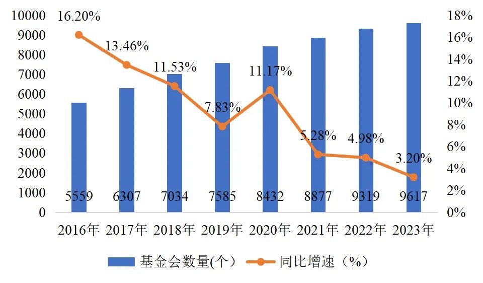 1數(shù)據(jù)來源:2016年到2022年的全國基金會數(shù)量來自民政部的歷年民政事業(yè)發(fā)展統(tǒng)計公報;2023年的基金會數(shù)量來自民政部的2023年4季度民政統(tǒng)計數(shù)據(jù)。