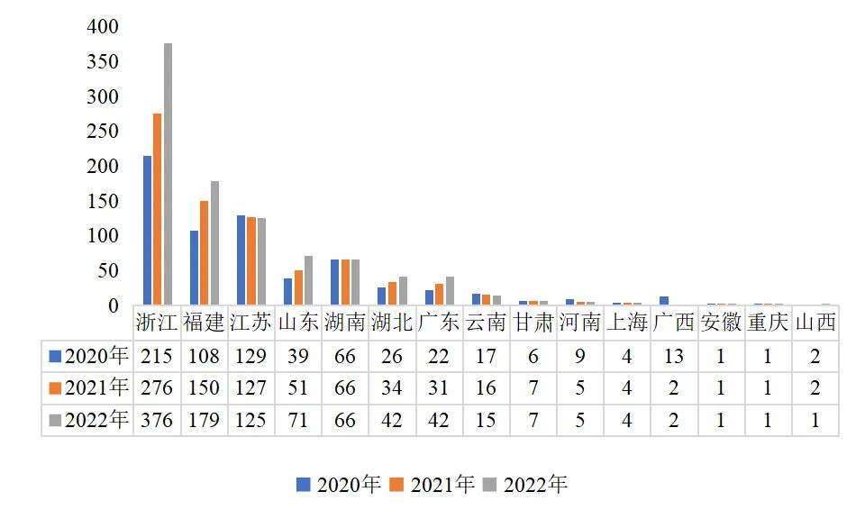 圖3 2020-2022年縣級基金會地區(qū)分布(個)3